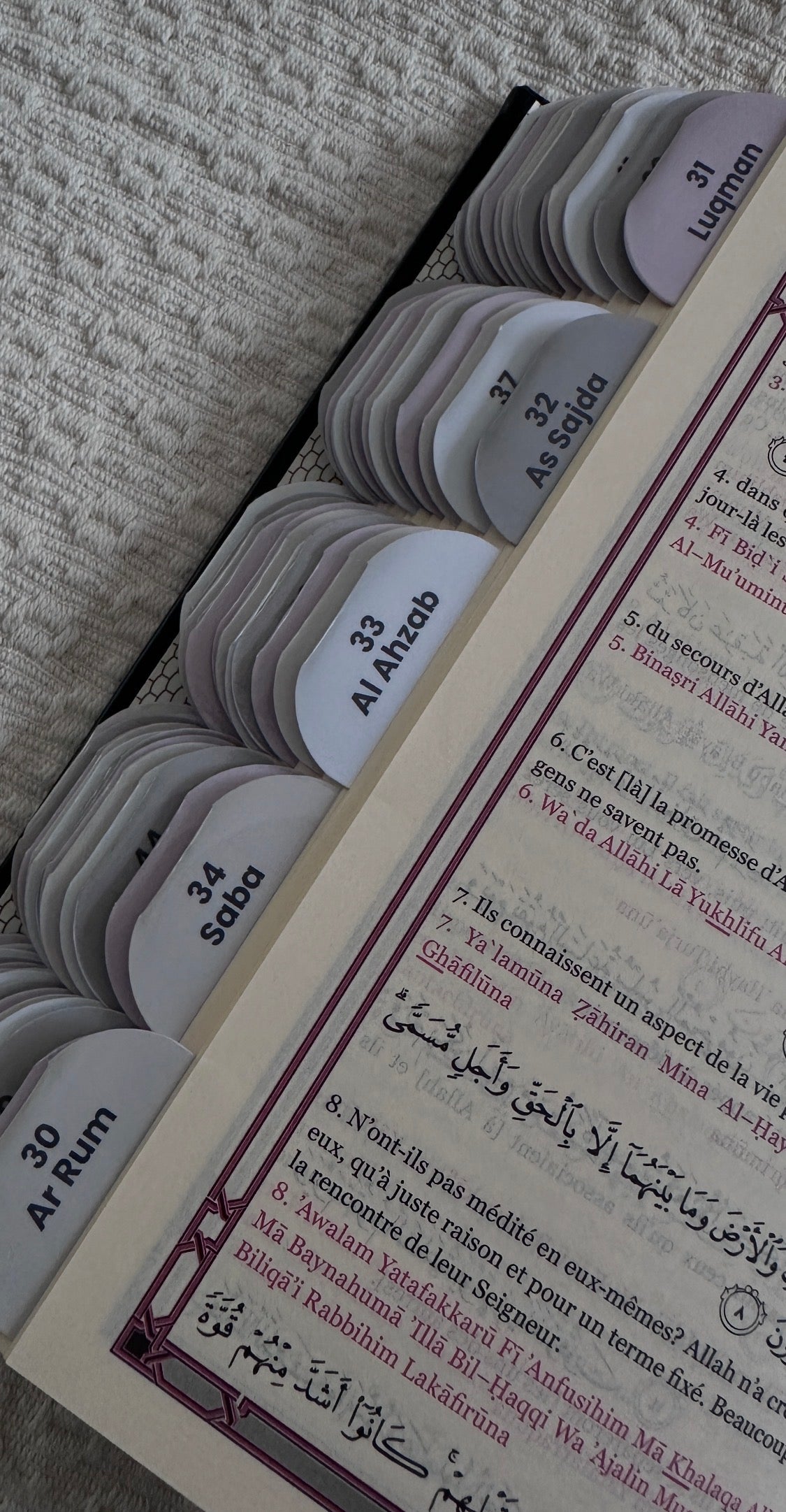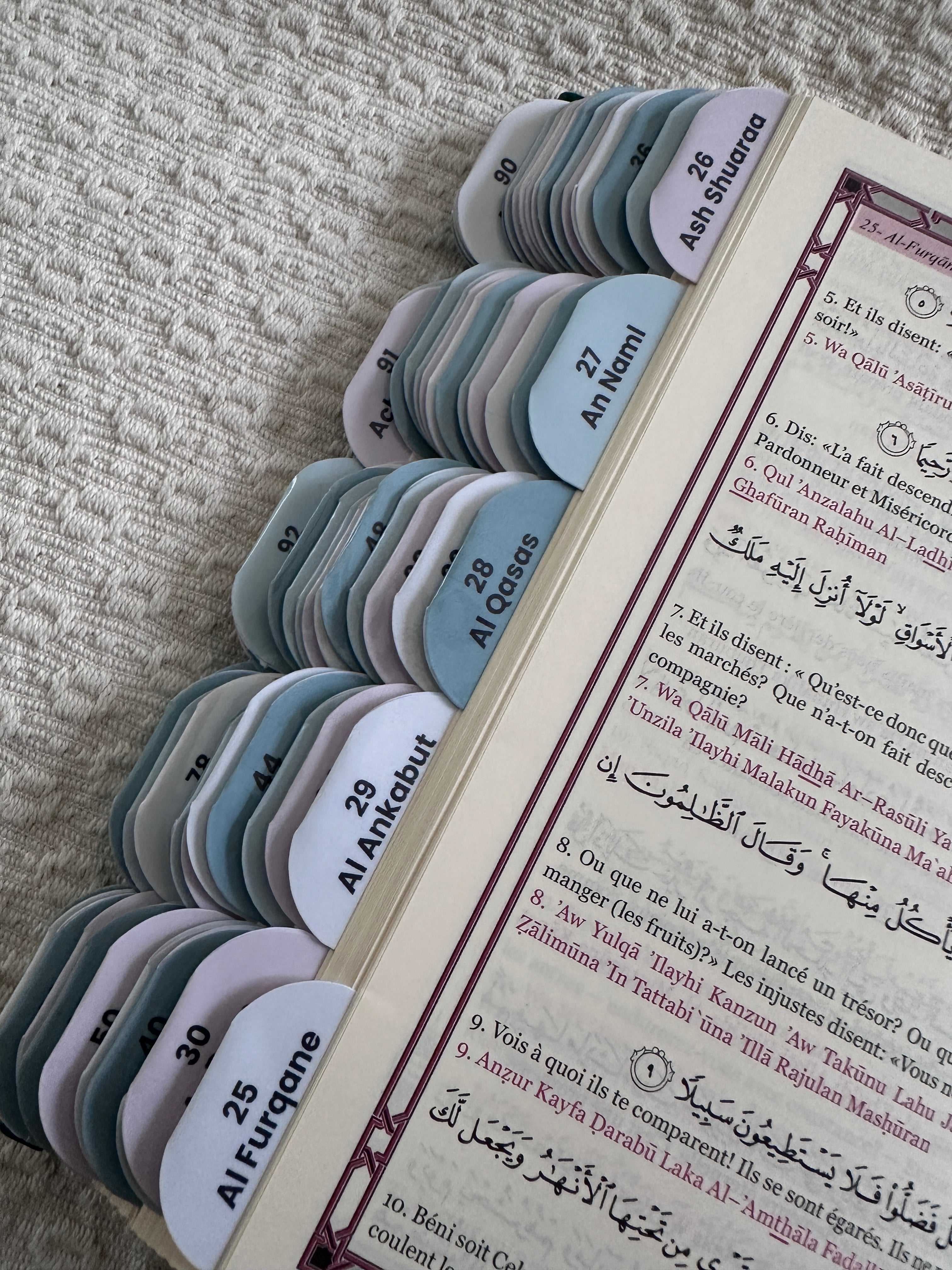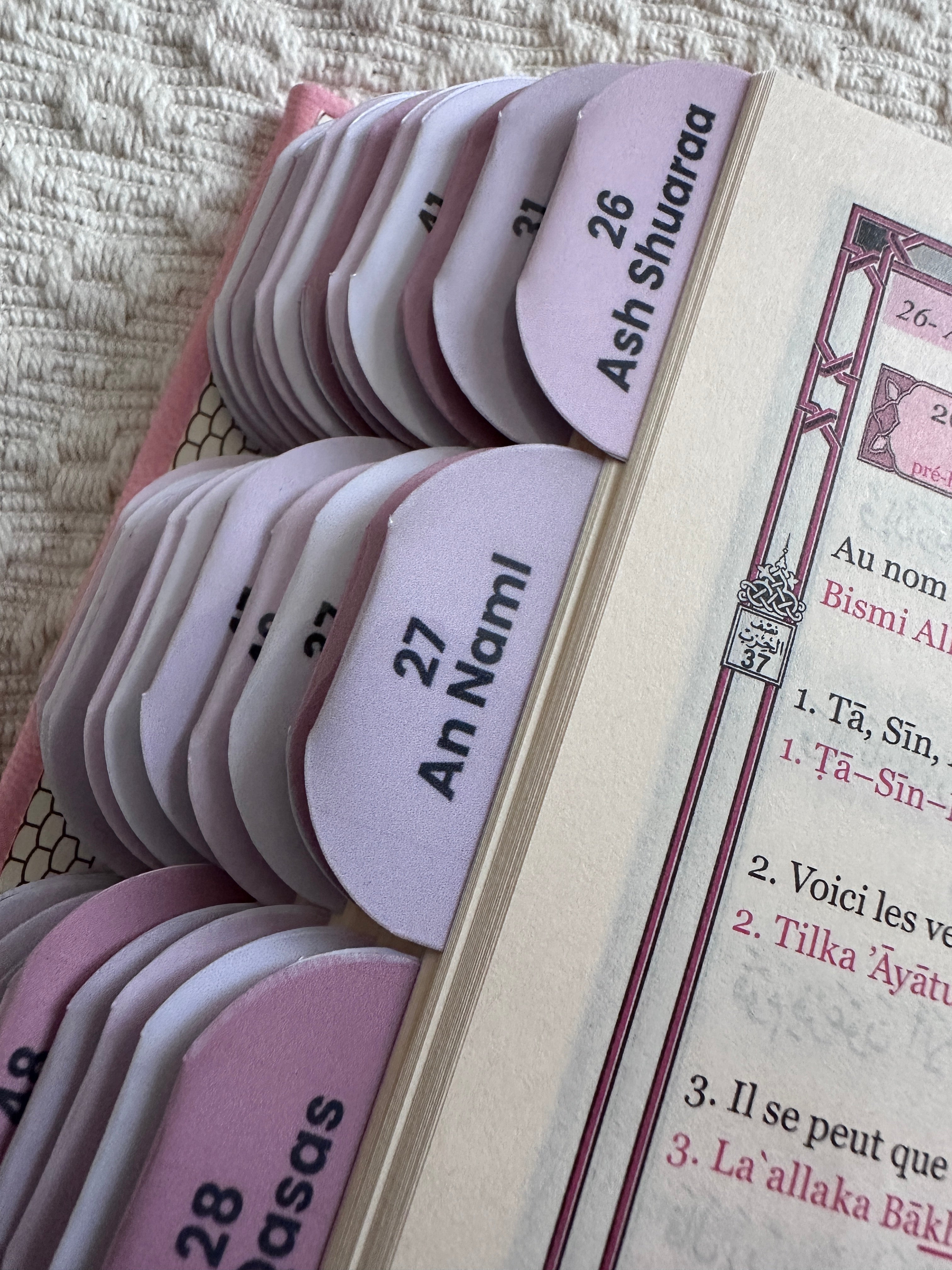Les onglets sont géniaux, je trouve directement les sourates selon mon état d’esprit. Plus besoin de chercher pendant 10 minutes.